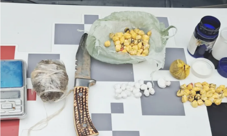 Durante a busca, o autor indicou espontaneamente dois potes escondidos em um armário, contendo crack e cocaína. Ainda no móvel, os policiais localizaram uma balança de precisão e outro invólucro de cocaína. Em uma bolsa na cozinha, foram encontradas uma faca com resquícios de crack e uma porção de maconha. Outras pequenas quantidades da droga foram localizadas na geladeira e dentro de um cano na área externa.
