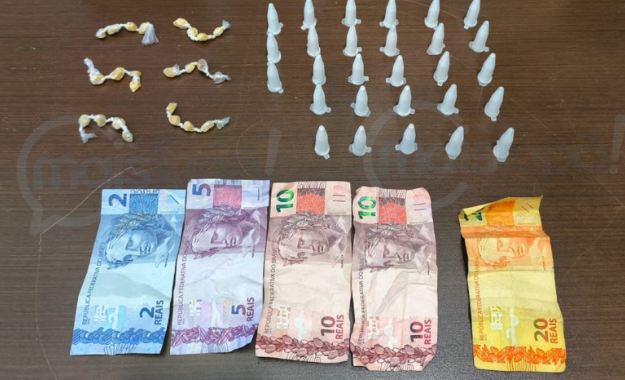 Após a abordagem, em revista pessoal, foram localizados no short do indivíduo R$ 47,00 em dinheiro, além de 28 porções de cocaína e 24 porções de crack. Questionado, ele assumiu a posse dos entorpecentes e afirmou que realizava a comercialização no local.