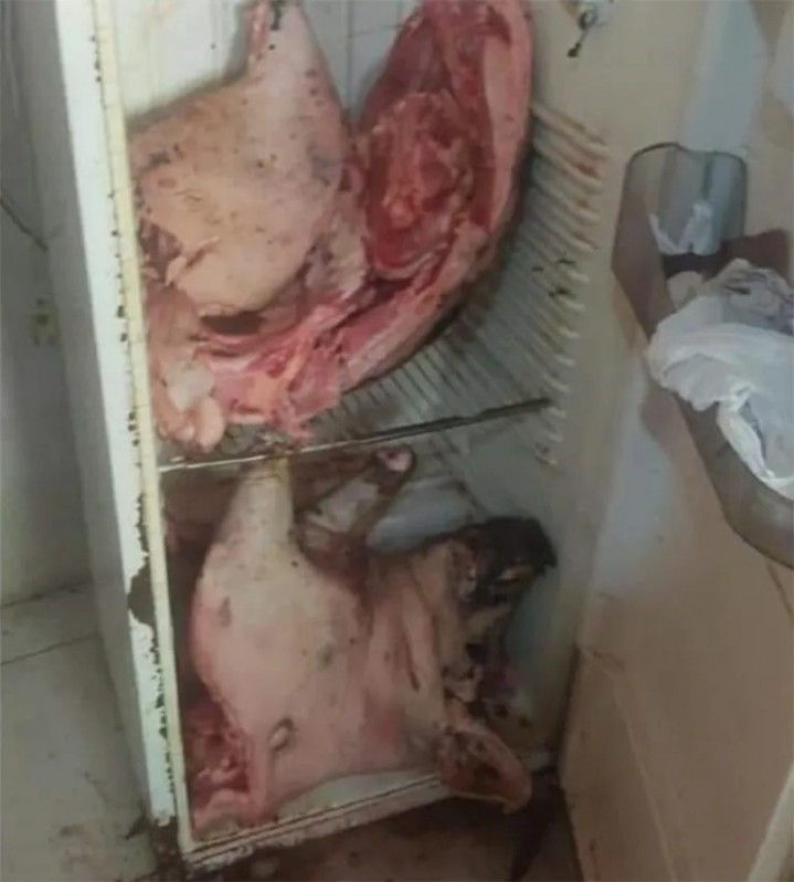 A carne do porco foi localizada em uma geladeira na casa do acusado, além de outros pertences utilizados para o abate.