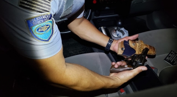 Realizando a busca pessoal e veicular, os policiais rodoviários tiveram êxito em encontrar entre os bancos dianteiros (próximo ao câmbio) um revólver marca Rossi oxidado um revolver marca Taurus, ambos calibre .38 (uso permitido), além de quatro munições intactas do calibre 38 no tambor e duas do calibre 38 sobressalentes, todas intactas.