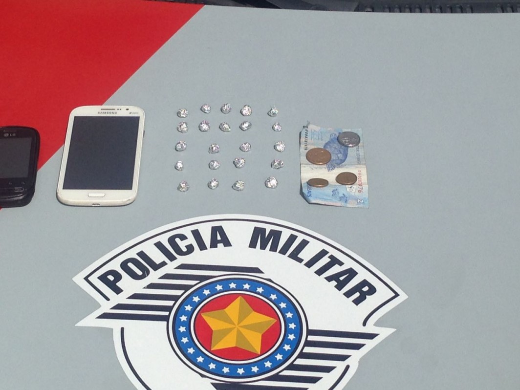 Na tentativa de não levantarem suspeitas, vieram em direção a viatura, e sendo de imediato abordados, foi encontrado com F.H.P.L. uma pedra de crack em seu bolso, e um celular que o indivÃduo tentou esconder na cueca, já com S.L.A. foi encontrado a quantia de R$ 2,95 e ao averiguar o objeto deixado na caixa de energia, foram encontrados dois invólucros de cor branca, um contendo quinze pedras de crack e outro sete invólucros da mesma droga.