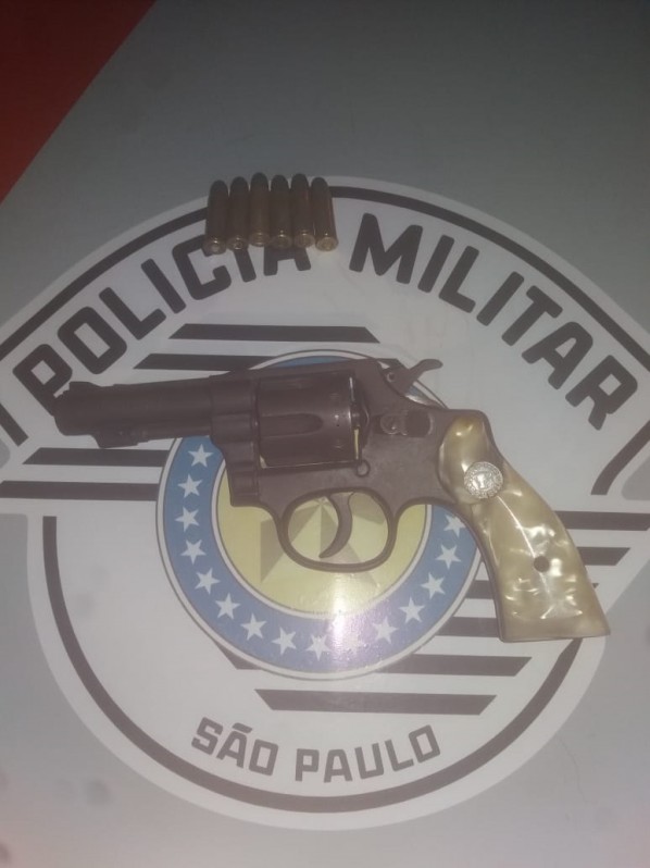 Foi realizada vistoria no interior da residência e na parte externa, onde os policiais localizaram em cima do muro lateral um revólver calibre 32 municiado com seis cartuchos intactos.