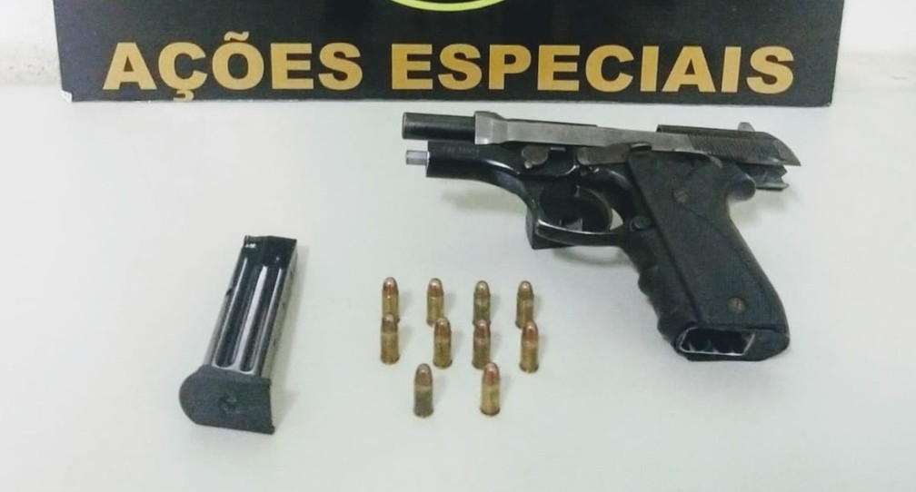 Durante revista, PMs encontraram a arma – uma pistola 765. Dez munições, que estavam no carregador, também foram apreendidas.