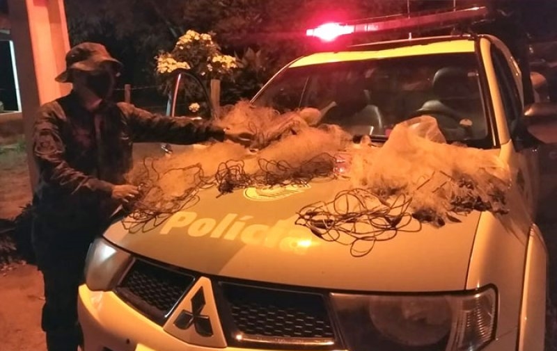 A Polícia Ambiental informou que durante patrulhamento terrestre, a equipe visualizou uma embarcação acoplada com motor de popa e ocupada por homens que estavam armando redes no Rio do Peixe, nas proximidades de um rancho. Os policiais ambientais permaneceram em meio a mata ciliar e no momento que desembarcaram realizaram a abordagem, porém, os homens empreenderam fuga, más foram acompanhados e detidos. Com apoio da embarcação e auxílio dos abordados, os policiais retiraram as redes que estavam no rio.