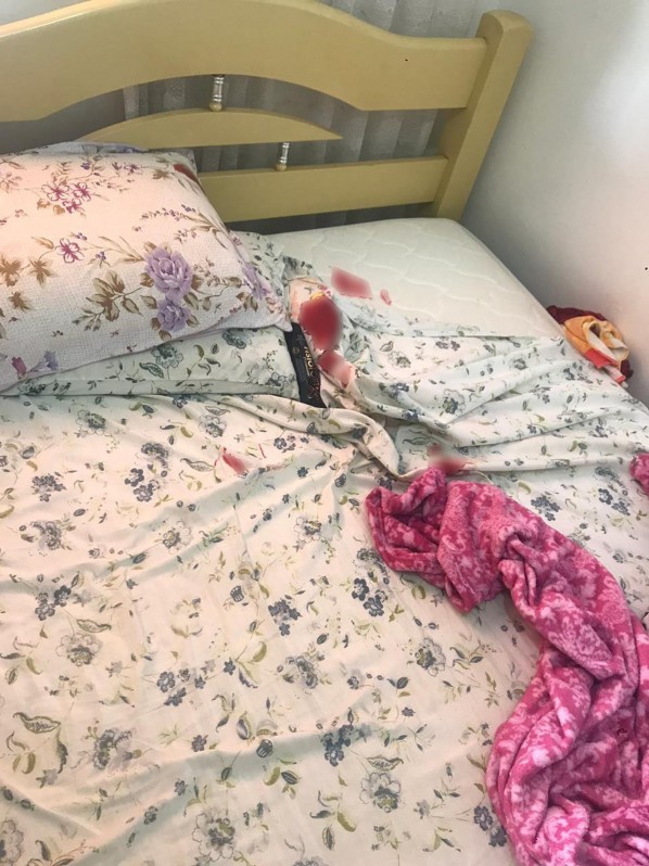 No local, a guarnição ouviu gritos de dentro da casa. A equipe entrou e, no quarto, encontrou o casal em cima da cama. De acordo com os policiais, o acusado estava sobre a vítima, segurando um facão.