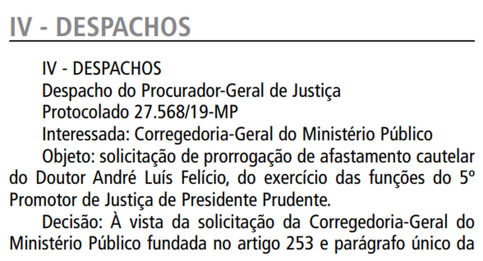 O pedido apresentado pela Corregedoria-Geral foi baseado no artigo 253 (e parágrafo único) da Lei Orgânica Estadual do Ministério Público.