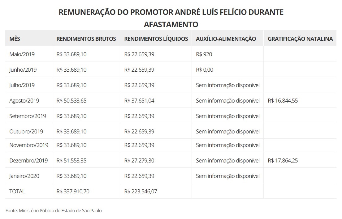 O promotor de Justiça André Luís Felício recebeu R$ 223.546,07 em salários líquidos, entre os meses de maio de 2019 e janeiro de 2020, mesmo estando afastado de suas funções no Ministério Público do Estado de São Paulo desde abril do ano passado, por determinação do procurador-geral de Justiça do Estado de São Paulo, Gianpaolo Poggio Smanio.