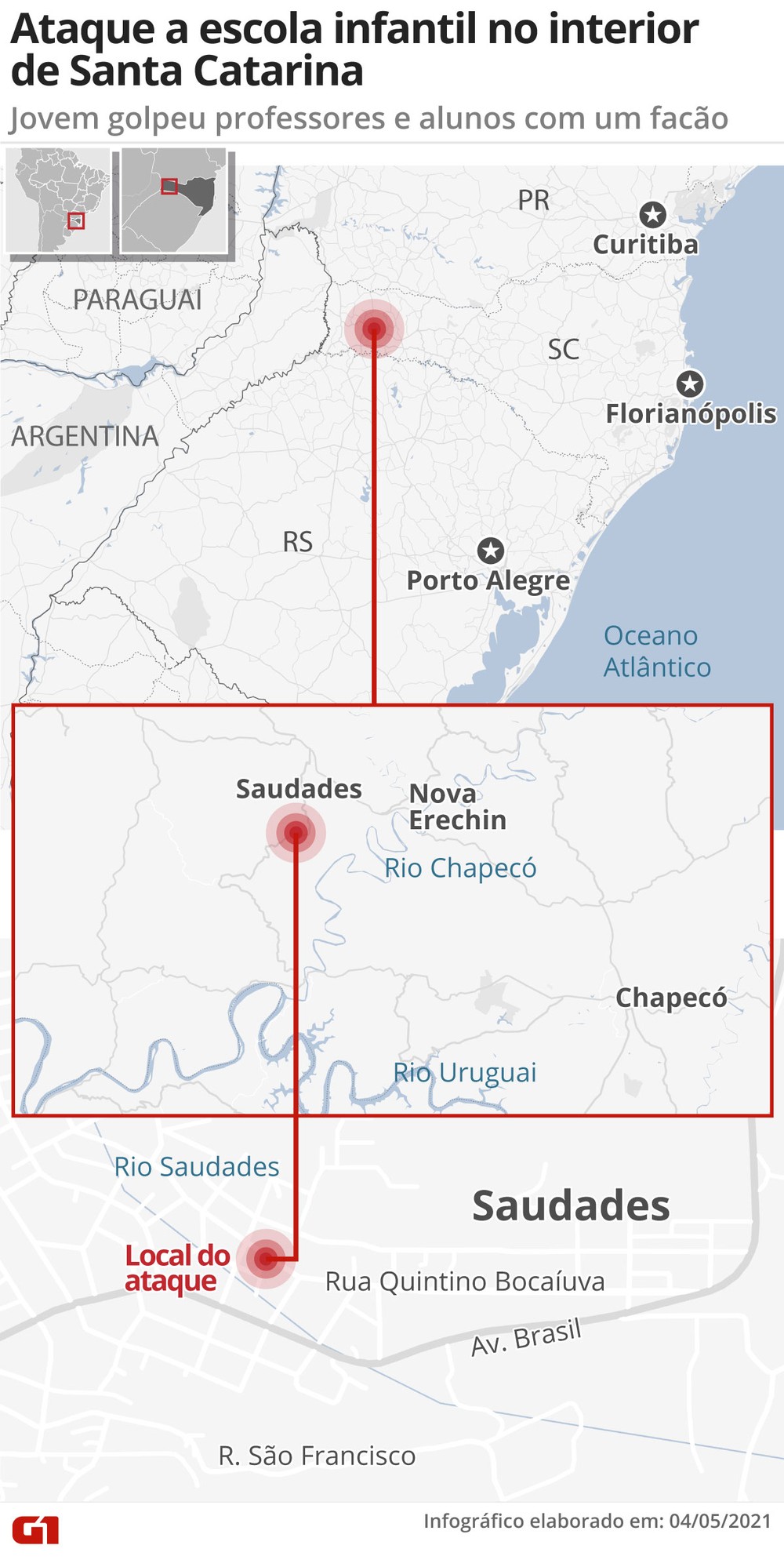 Três crianças e duas funcionárias de uma escola infantil de Saudades, no Oeste de Santa Catarina, morreram após um ataque à faca nesta terça-feira (4). O assassino, um jovem de 18 anos, deu golpes contra o próprio corpo e foi levado em estado gravíssimo para um hospital da região após o crime.