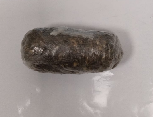 A mulher, ao passar pelo procedimento de revista no escâner corporal, apresentou imagem suspeita na região pélvica. De forma espontânea, ela entregou um invólucro contendo substância esverdeada com características de maconha.