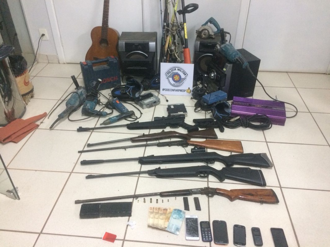 Durante as investigações os policiais chegaram a uma chácara, próximo a usina de álcool de Lucélia, onde o indivíduo foi abordado e os policiais localizaram, além de uma arma de fogo e munições de calibre 38 e 22, os objetos furtados da residência no Salto Botelho.