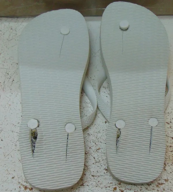 Havia quatro invólucros escondidos dentro dos chinelos e cada um deles continha uma folha preta de papel umedecida com aparência da droga sintética conhecida como M4.