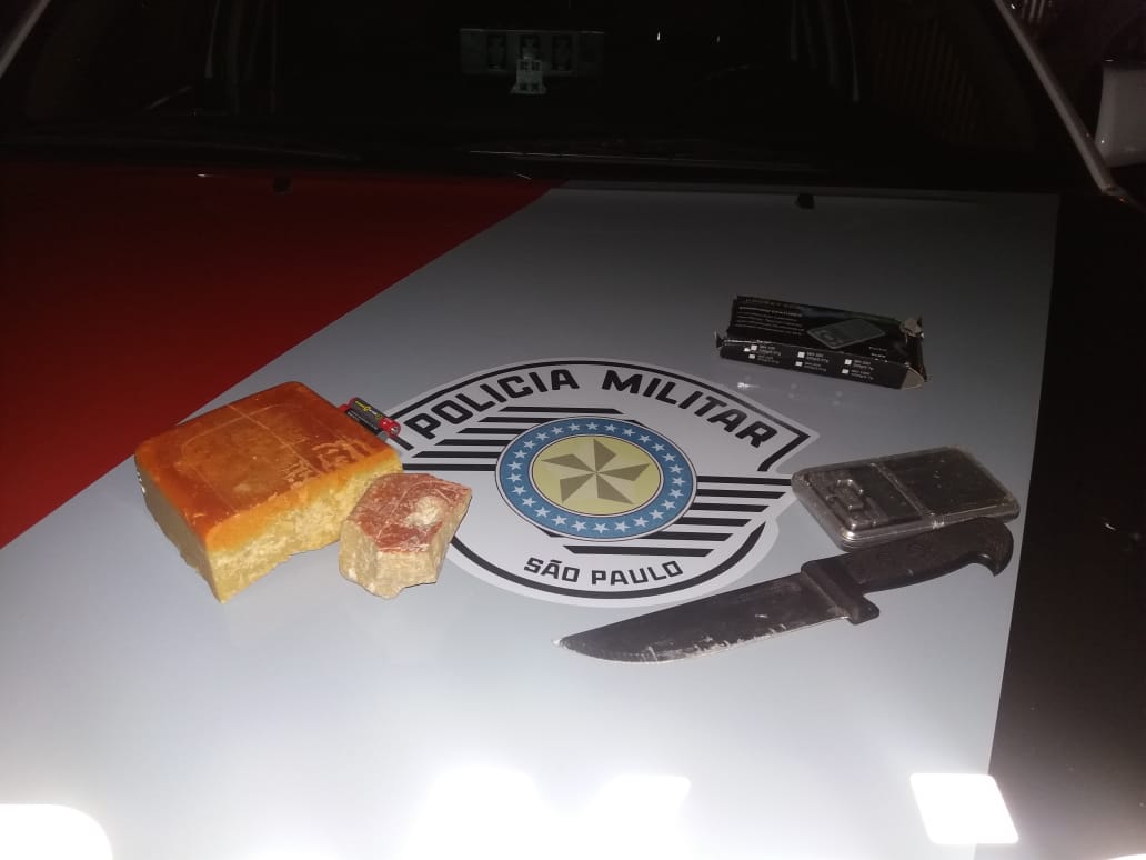 De imediato a equipe se deslocou para o local em que o menor havia entrado, onde, em buscas, foi localizado duas pedras brutas da mesma droga, totalizando 0,601 Kg, balança de precisão, faca de mesa e várias embalagens para acondicionar a droga.