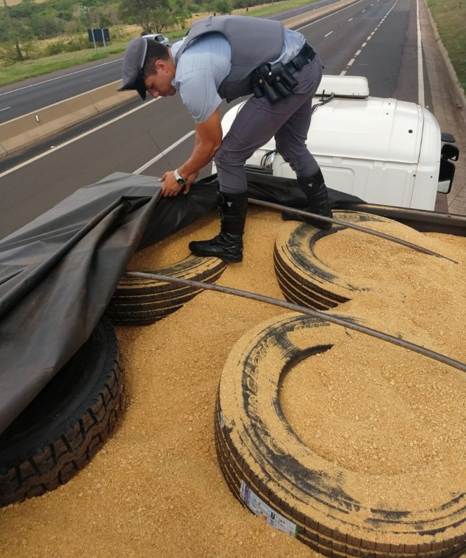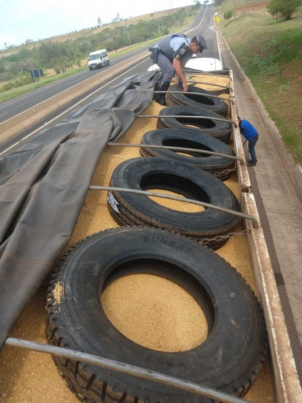 Uma equipe policial abordou uma carreta, com placas de Ponta Porã (MS), conduzido por um homem de 46 anos, e durante fiscalização localizou dentro da carroçaria do semirreboque, em meio a carga de farelo de milho, 12 pneus de caminhão oriundos do Paraguai, sem documentação fiscal.