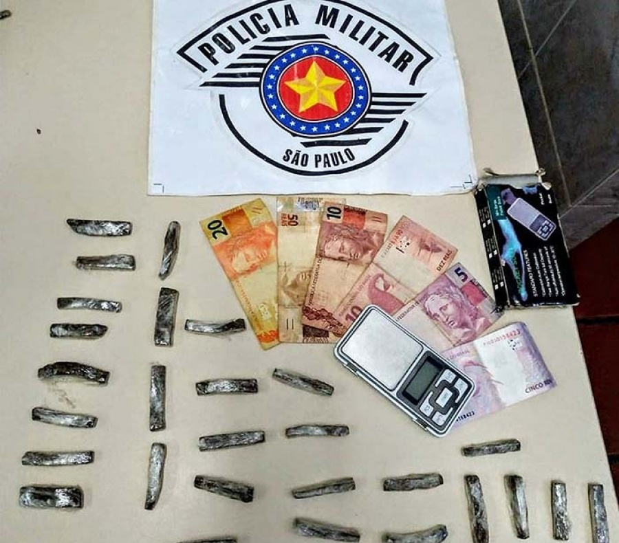 A Polícia Militar informou que em posse do rapaz foram apreendidos dois invólucros com substância aparentando ser maconha e R$ 100,00 em notas e moedas. Os PMs encontraram no local uma sacola com mais 27 invólucros com substancia semelhante a maconha.