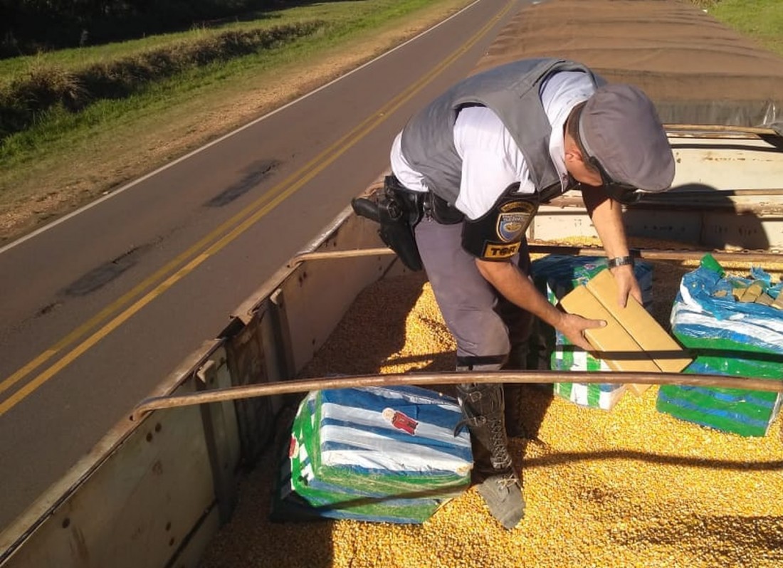 Durante ação fiscalizadora de trânsito, visando o combate de ilícitos administrativos e penais, a Polícia Rodoviária abordou o caminhão Volvo, com placas de Maravilha/SC, na Rodovia Arlindo Bétio, em Teodoro Sampaio, tracionando os semirreboques com placa de Maravilha/SC, ambos carregados de milho a granel, sendo que, no interior dessa última unidade, entre a carga de milho, foi localizado grande quantidade de maconha.