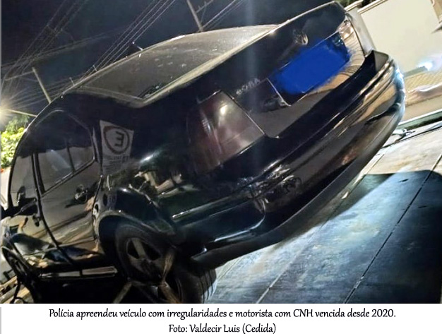 Segundo informações da PM, o automóvel trafegava em alta velocidade, colocando em risco a segurança da via. Ao ser parado, constatou-se que o condutor estava com a Carteira Nacional de Habilitação vencida desde novembro de 2020 e que o veículo não tinha licenciamento atualizado - o último registro era de 2024. Além disso, os policiais identificaram pneus em mau estado de conservação, ausência de equipamentos obrigatórios e a numeração do motor suprimida.
