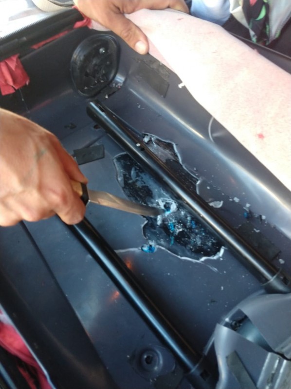 Durante ação fiscalizadora de trânsito, visando o combate de ilícitos administrativos e penais, uma equipe do Policiamento Rodoviário, abordou um ônibus, com itinerário Campo Grande/MS x São Paulo/SP, com 19 passageiros, ao proceder uma vistoria no bagageiro externo do coletivo, foi localizada uma mala, na cor vermelha, devidamente identificada, com algumas peças de roupas a qual trazia ainda um fundo falso, confeccionado nas extremidades da mala, frente e fundo, trazendo em seu interior 02 (dois) pacotes plásticos, contendo cocaína.