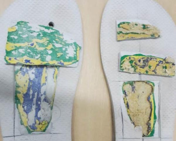 Levada para uma sala reservada, o chinelo foi cortado e constatou-se que se tratava de maconha, cocaÃna e uma substância aparentando ser pasta base de cocaÃna.