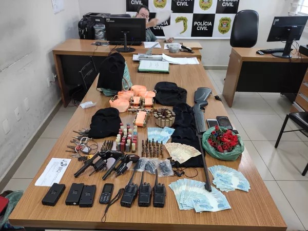 Durante o cumprimento dos mandados, os policiais encontraram armas e máquinas de choque com os suspeitos.