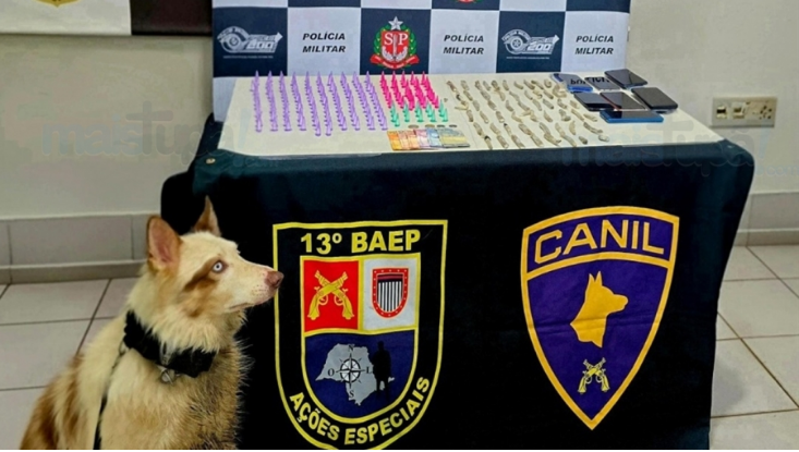 O morador da residência foi encontrado no cômodo da frente, onde foram apreendidos sete celulares e uma motocicleta que estava em sua posse, recolhida administrativamente. Com o auxílio do cão farejador Bruce, os policiais também localizaram em um terreno baldio em frente ao imóvel uma sacola com uma pochete contendo 192 microtubos de cocaína, 56 porções de maconha e duas porções de haxixe.