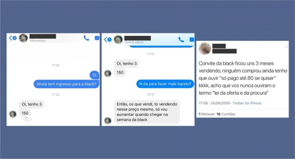 Foi obtido acesso ao conteúdo que motivou a ida do promotor de eventos à Polícia. Em conversas por aplicativos de mensagens, o ingresso para a festa é oferecido pelo valor de R$ 150, e o possível cambista diz ter três convites para venda, o que sugere ter feito compra antecipada nos pontos oficiais de venda - cujo lote inicial era de R$ 50 - e agora, com os ingressos esgotados, coloca à venda pelo triplo do preço, valor considerado abusivo.