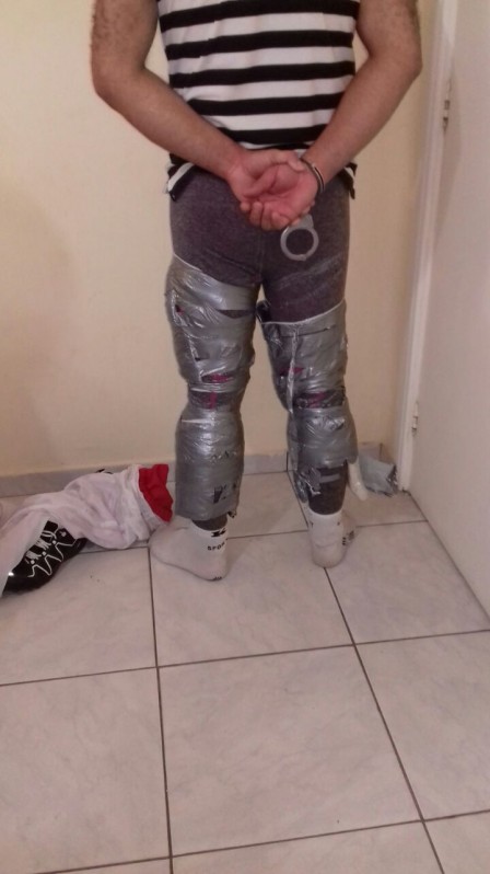 Diante dos fatos, após realizar revista pessoal minuciosa no mesmo, foi encontrado amarrado em suas pernas por uma fita adesiva de cor cinza, 3,90 kg (três kg e novecentos gramas) de pasta base de cocaÃna, oculta sob uma calça de abrigo.