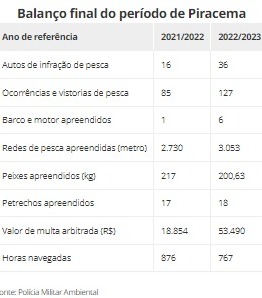 No Oeste Paulista, a última Piracema aconteceu entre os dias 1º de novembro de 2022 e 27 de fevereiro de 2023. Além do aumento do valor total das multas, no comparativo com 2021/2022, houve crescimento nos autos de infração de pesca, ocorrências e vistorias de pesca e apreensão de barcos, motores, redes e petrechos.