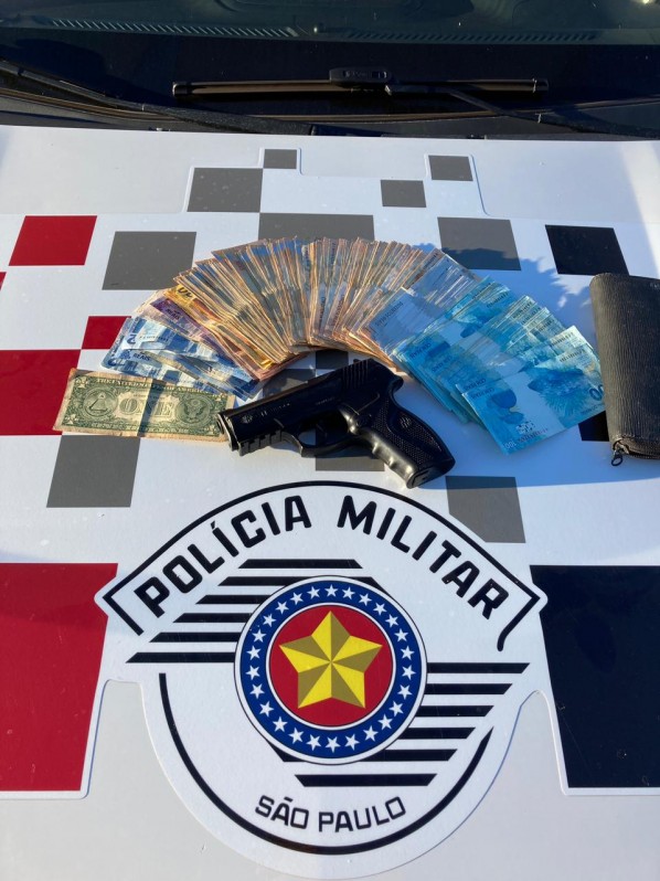 Em vistoria no veículo, foi localizada uma carteira com o dinheiro da vítima, totalizando R$18.336,00 e US$1,00. Com o apoio de outras equipes policiais militares foi localizada uma réplica de pistola no local indicado pelos autores.