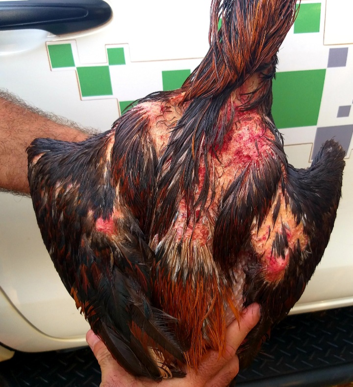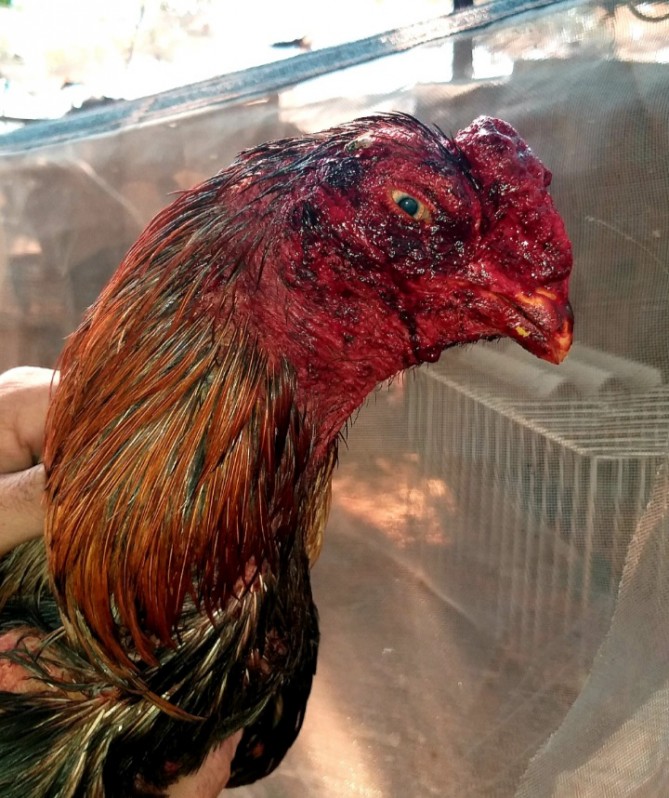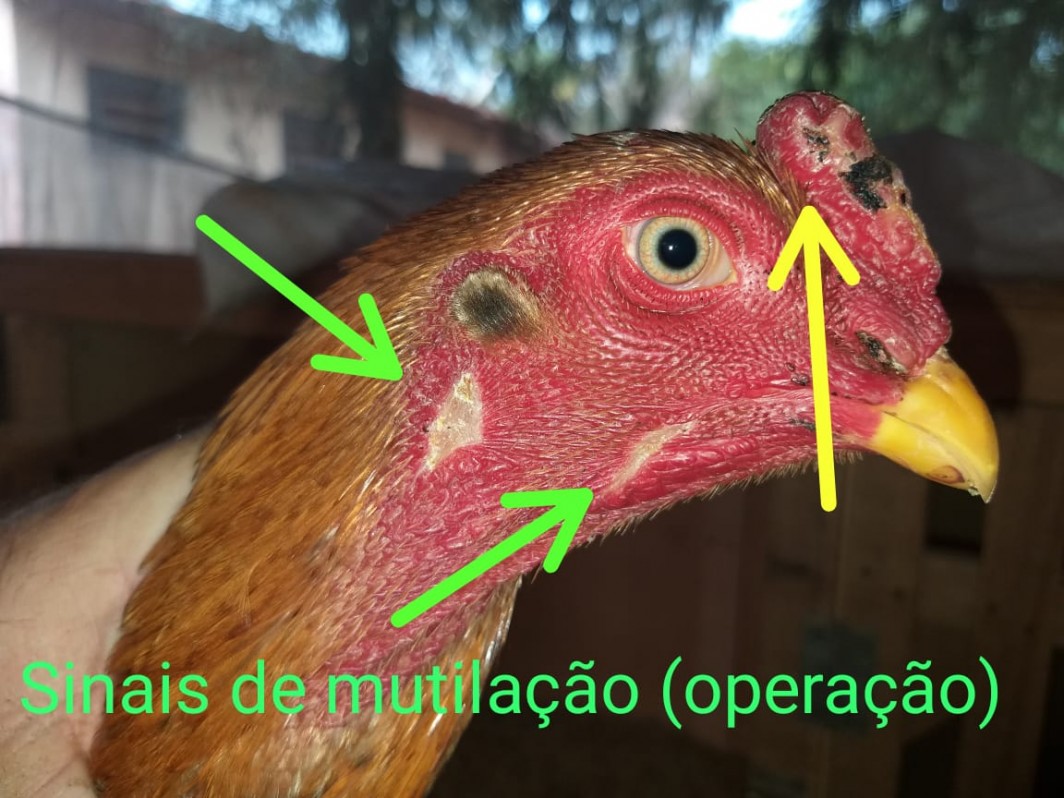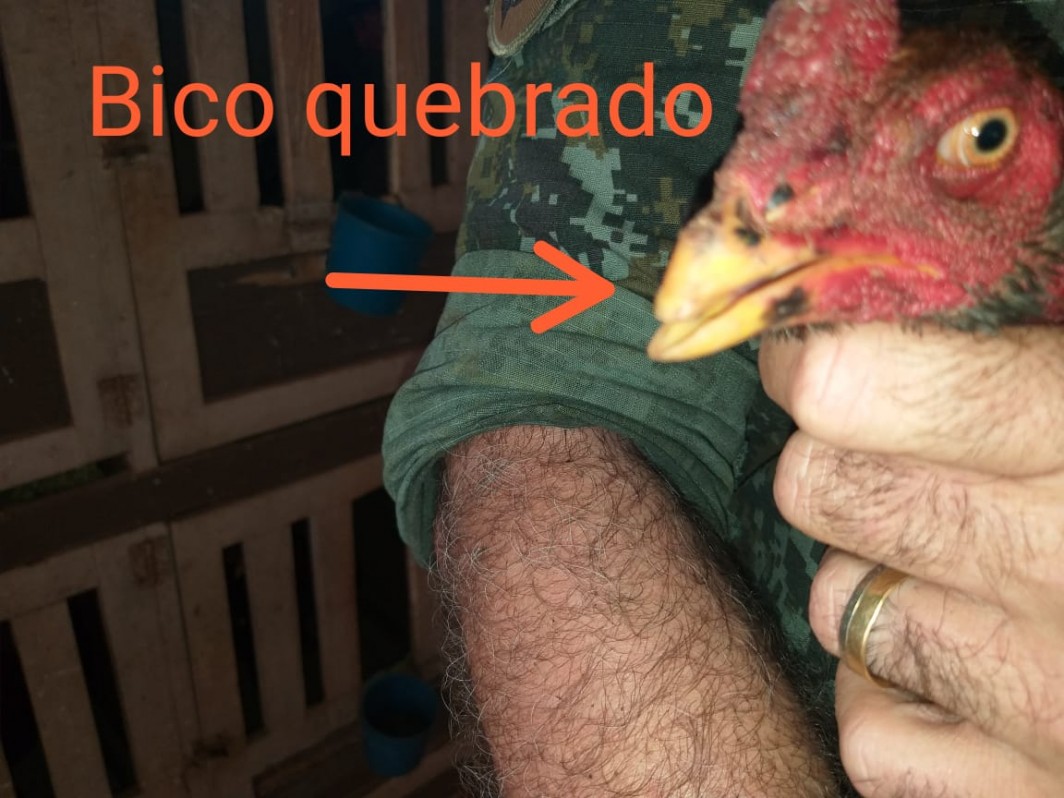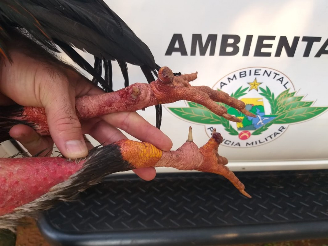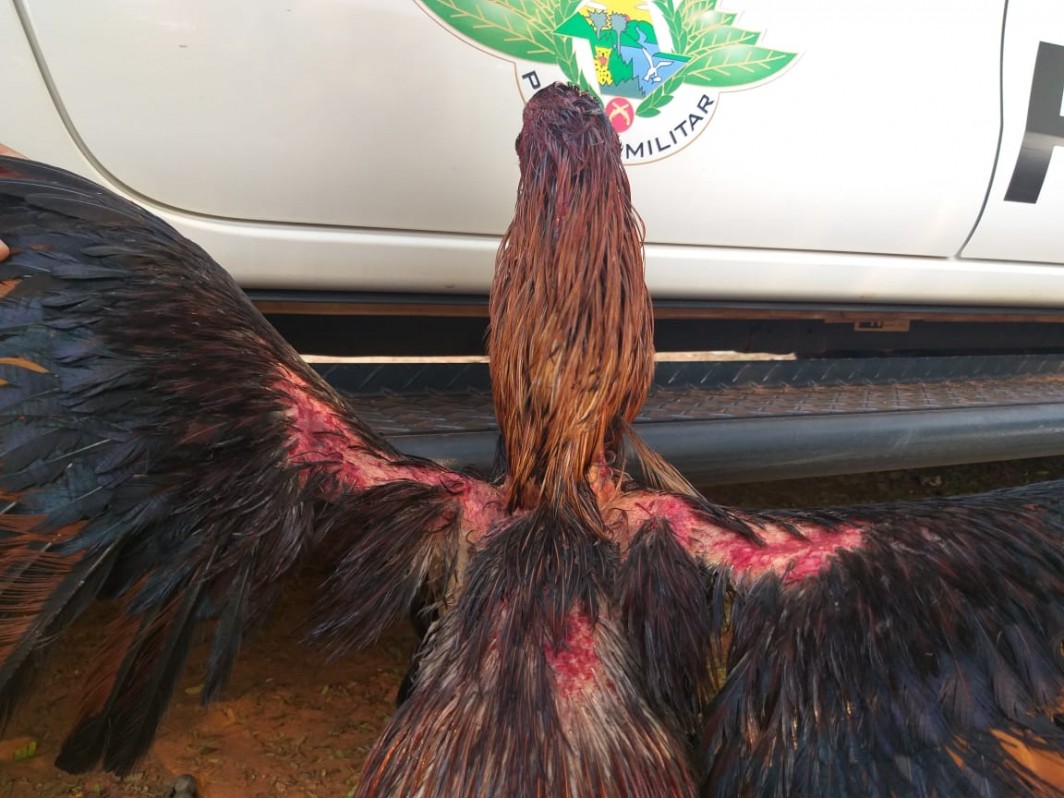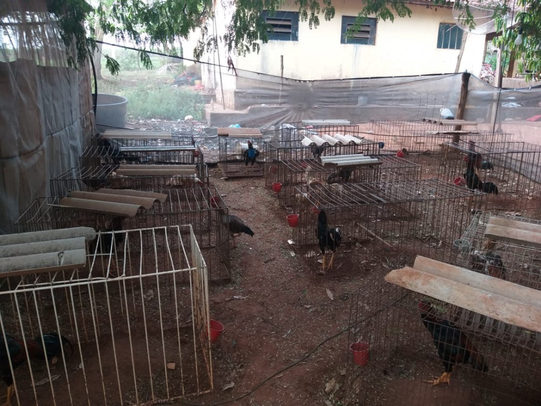 Na propriedade os policiais encontraram 54 galos índios presos em viveiros de madeira e passeadores de ferro, todos sem água e alimento. Durante a vistoria nos animais, 4 galos estavam com bicos quebrados e 9 galos com vários ferimentos na cabeça, peito, costa e pernas, possivelmente causados por esporas e bicos em combates.