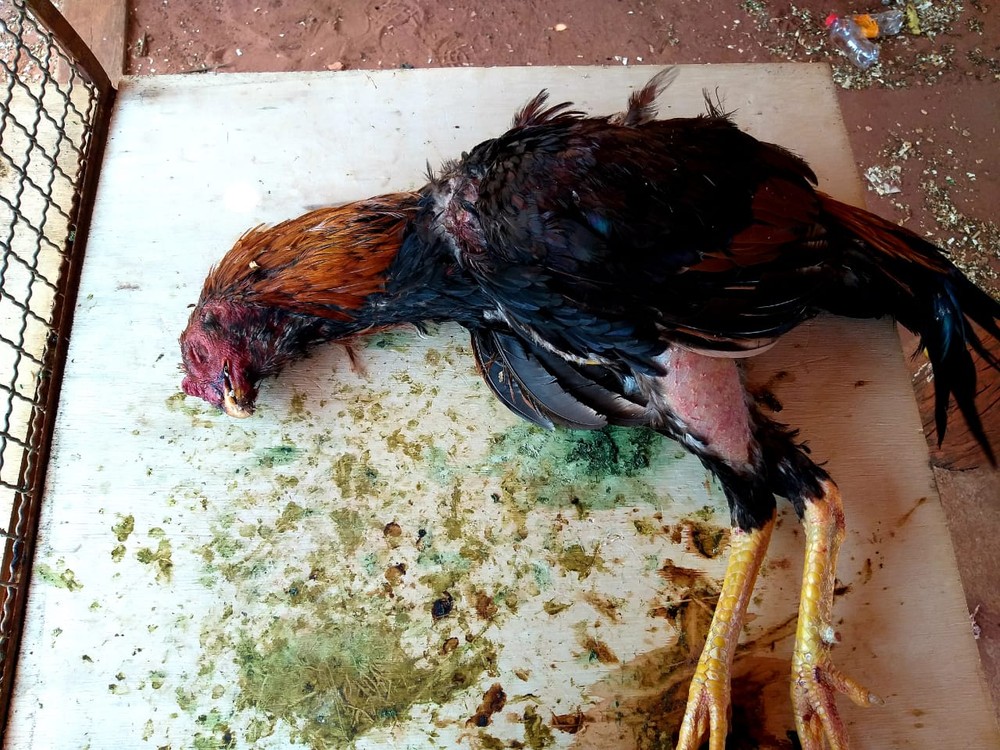 Ainda foram encontrados três galos calçados com esporas de acrílico, que já tinham participado da rinha. Durante a ocorrência, um galo índio que estava debilitado, morreu.