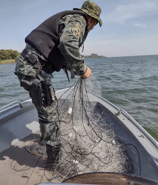 A Polícia Militar Ambiental recolheu e apreendeu, nesta quarta-feira (27), 600 metros de redes de pesca que estavam armadas irregularmente no Rio Paraná, em Rosana (SP).