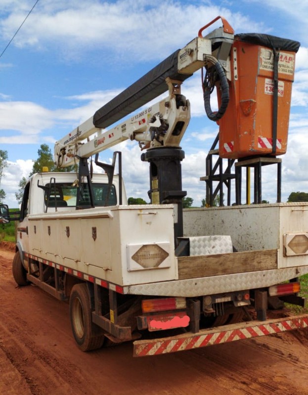 Se trata de um caminhão com equipamento cesto aéreo, normalmente utilizado para manutenção de iluminação pública.