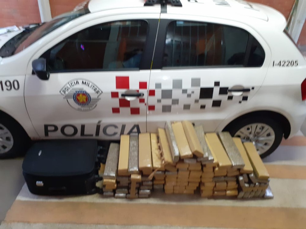 A equipe abordou a dupla e encontrou dentro da mala de viagem um pacote envolto em saco de cor preta com 15 tabletes de maconha.