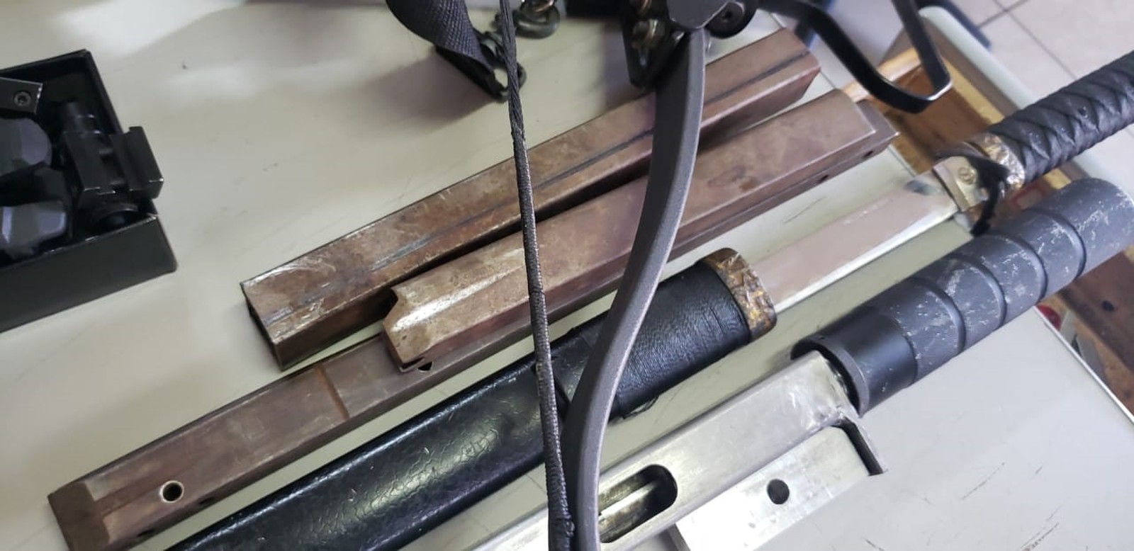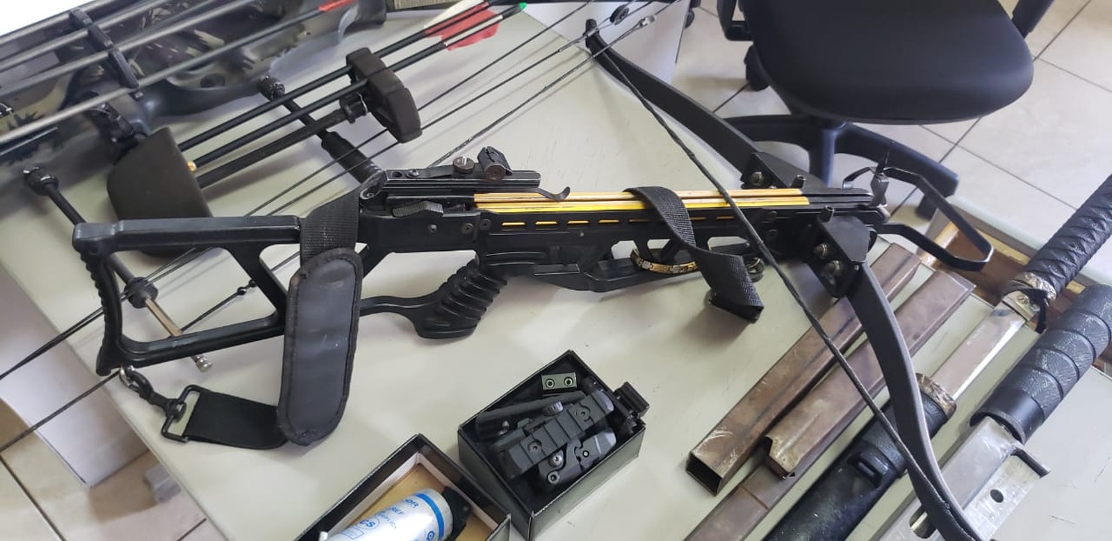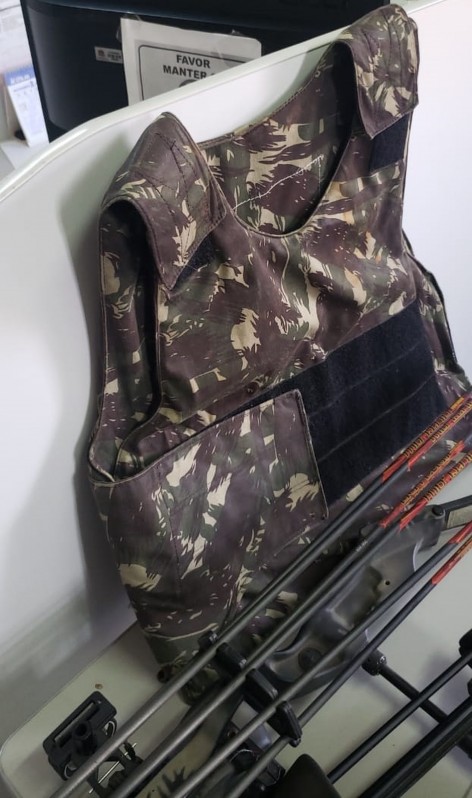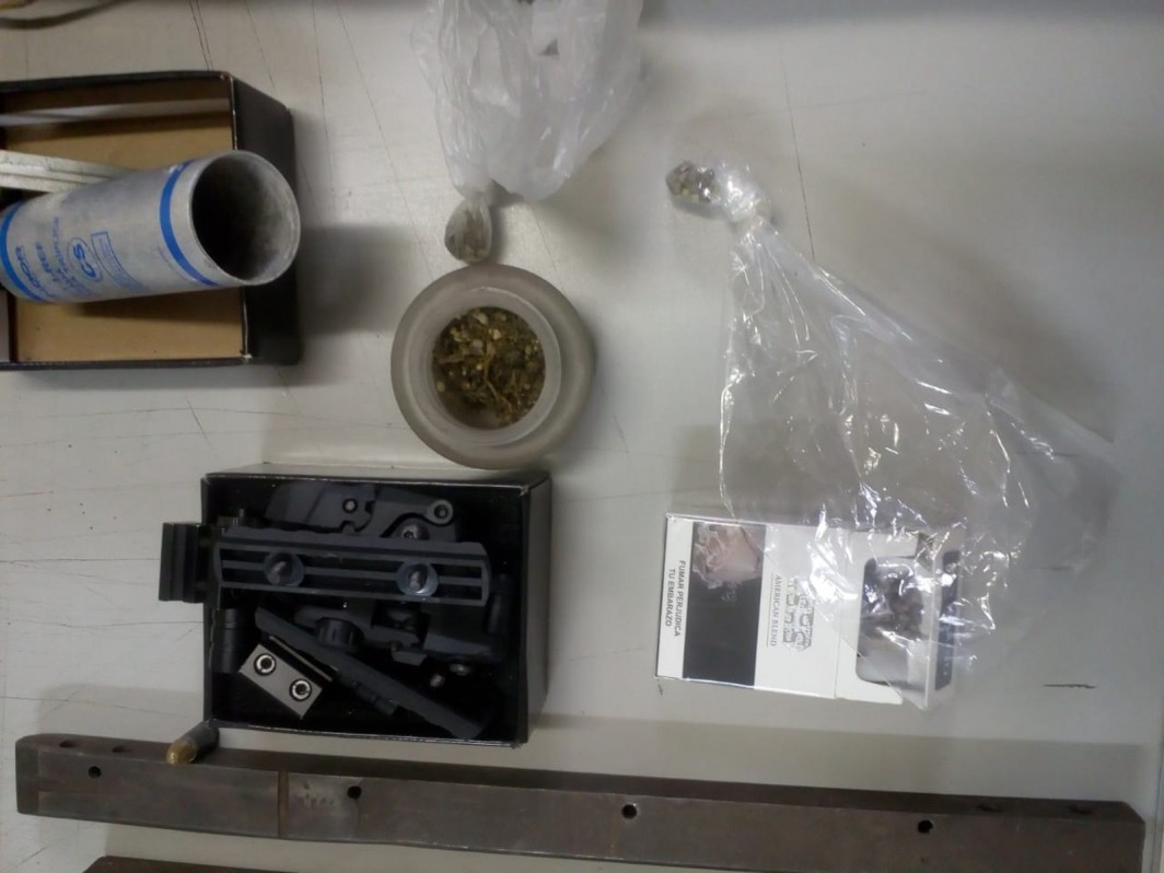 No local, foram apreendidos um carregador de munição de fabricação caseira, uma munição de calibre 9mm, um colete balístico do Exército brasileiro, um silenciador, arcos e flechas, uma besta e uma mesa própria para a fabricação e o conserto de armamentos, além de porções de maconha.