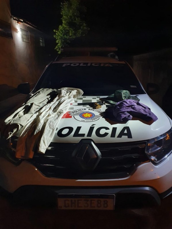 O autor possui um veículo golf branco que estava na residência coberto com uma lona preta, também entregou a camisa azul que usou para cobrir o rosto e a calça cinza que usava no momento do crime.