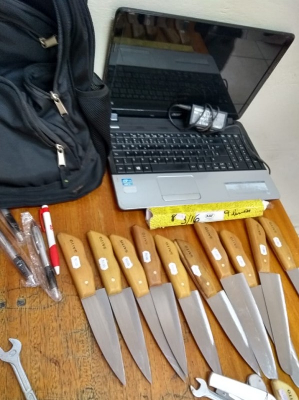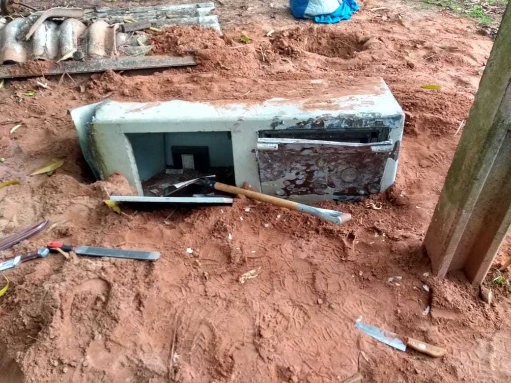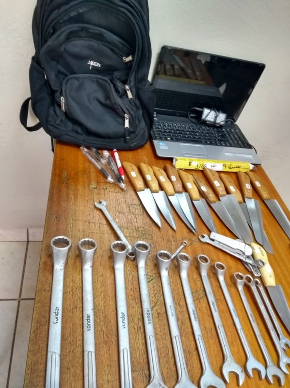 Abordados, os dois adolescentes, que já são conhecidos nos meios policiais pela prática de furtos, negaram estar ali para praticar ilícitos. Ambos alegaram que entraram na propriedade em busca de água, porém os policiais encontraram pelo local, uma bolsa preta contendo várias ferramentas e outros objetos, um notebook e várias facas, além de um cofre grande, com duas divisões, sendo que uma delas tinha sido arrombada.