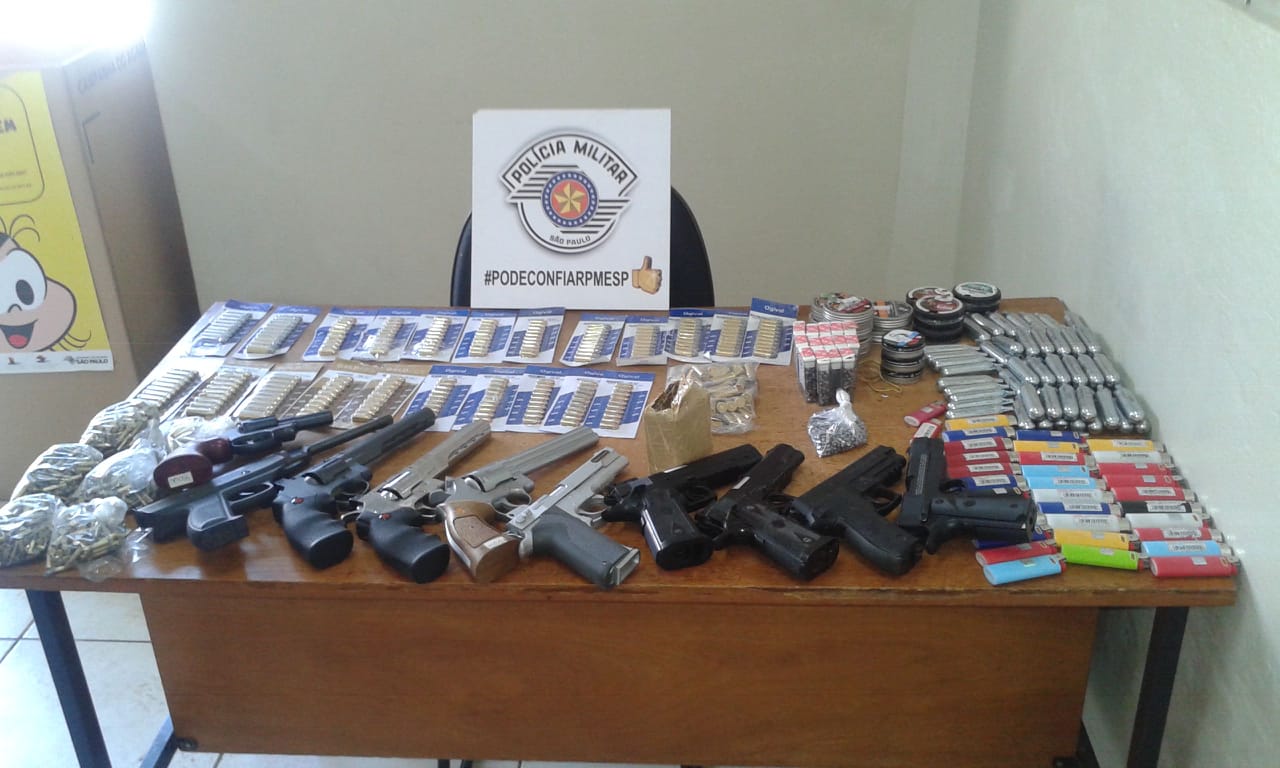 Foi realizada a abordagem aos rapazes e os policiais localizaram com ambos várias armas de pressão, mais de 1000 (mil) munições letais, grande quantidade de chumbinho, dichavador e duas armas de choque, objetos estes possivelmente produtos do furto ao estabelecimento comercial de artigos de pesca, caça e camping de Osvaldo Cruz. (relembre)