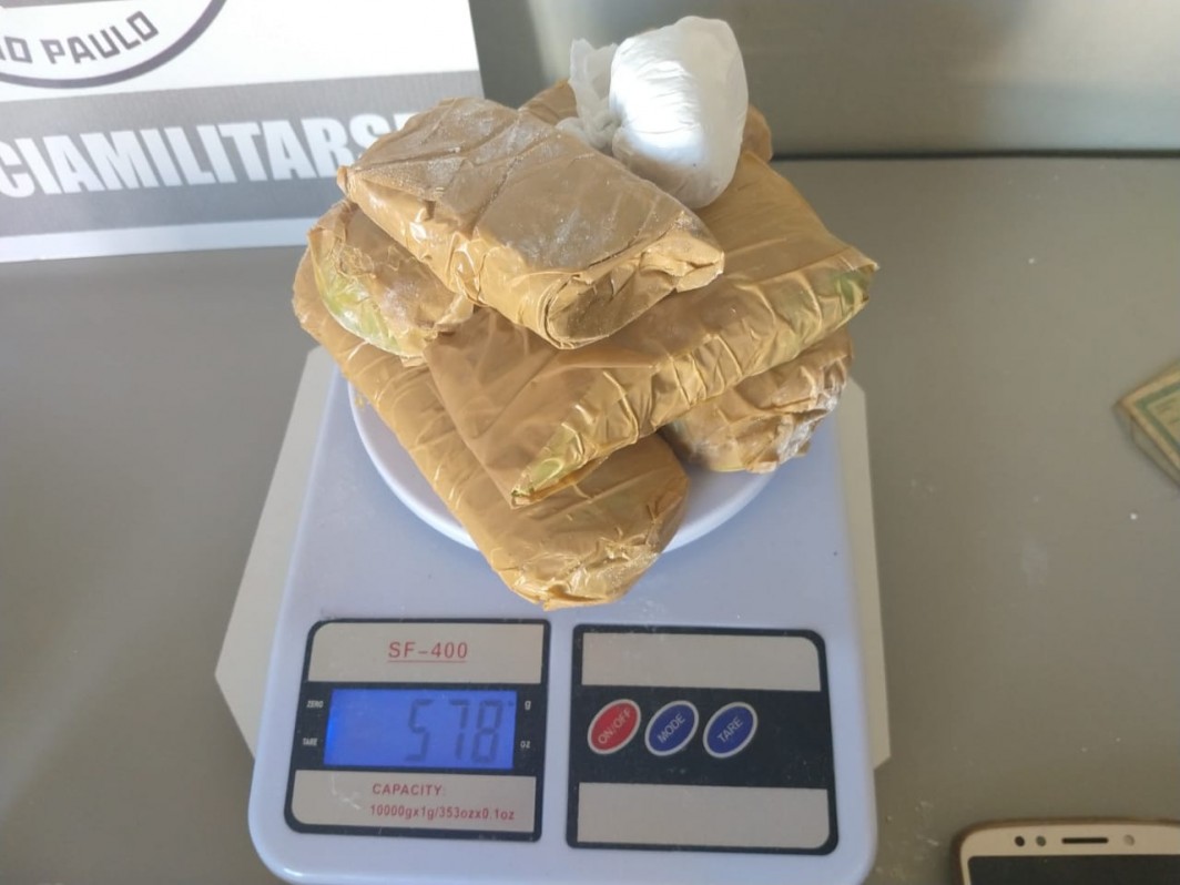 Ele foi abordado e passou por uma revista onde foi localizado em seu poder um papelote de cocaína. Posteriormente policiais realizaram vistoria na residência do mesmo e localizaram em seu quarto, uma caixa contendo cinco tijolos de cocaína pesando 0,549 Kg, uma balança de precisão, R$166,00 em notas diversas e materiais para embalar a droga (papel alumínio e rolo de fita marrom)