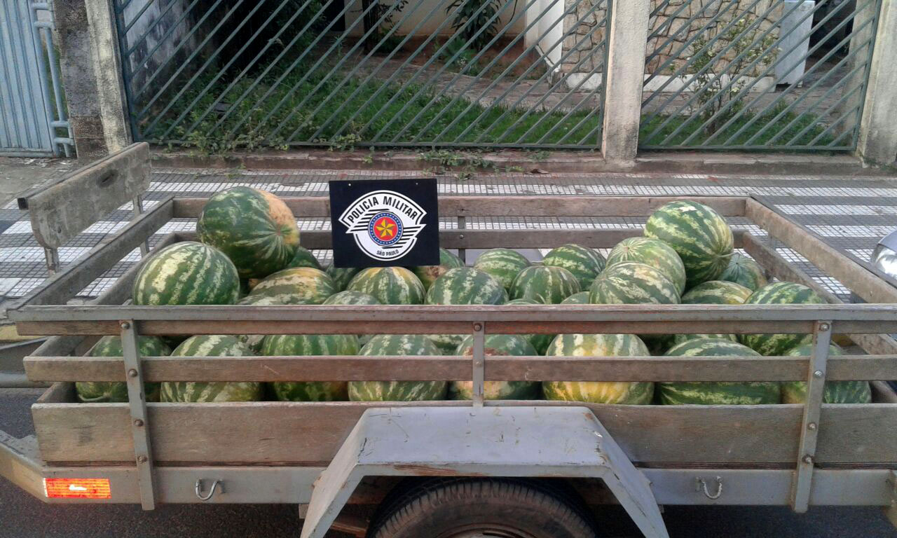 No total, foram recolhidas 121 melancias que tinham sido colhidas na propriedade rural, sendo 18 pessoas autuadas por furto e sete veÃculos envolvidos na ocorrência, inclusive, o Ford Fiesta acabou sendo apreendido por estar com o licenciamento vencido.