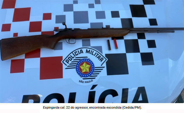 Já na Delegacia de Defesa da Mulher (DDM) da Polícia Civil de Adamantina, onde foi apresentada pela PM, a vítima informou à equipe que o ex-companheiro possui armamento em sua posse, uma espingarda, a qual ele usa para prática de caça e que deixa o armamento escondido próximo a um sítio no bairro do Prata. Ela disse saber local onde a arma estava escondida.