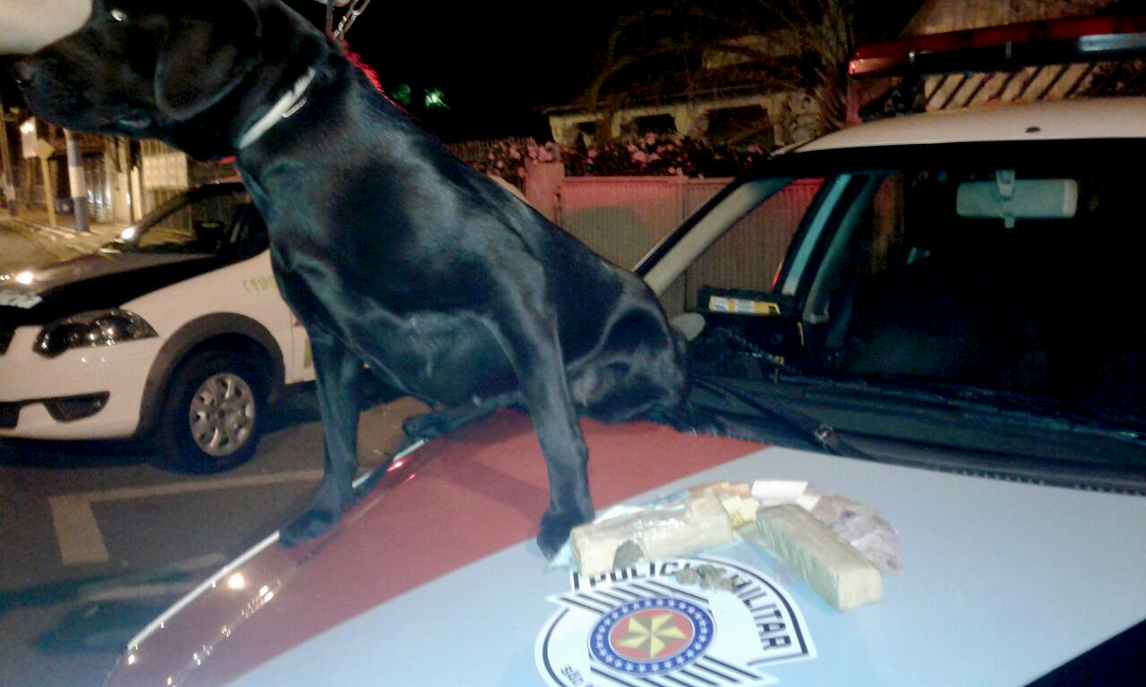 Com a autorização da amásia de M.C.C., foi realizada busca domiciliar, com o apoio do Canil, com a cadela Emy, onde foi localizado dois tabletes de maconha que pesaram 361 gramas.