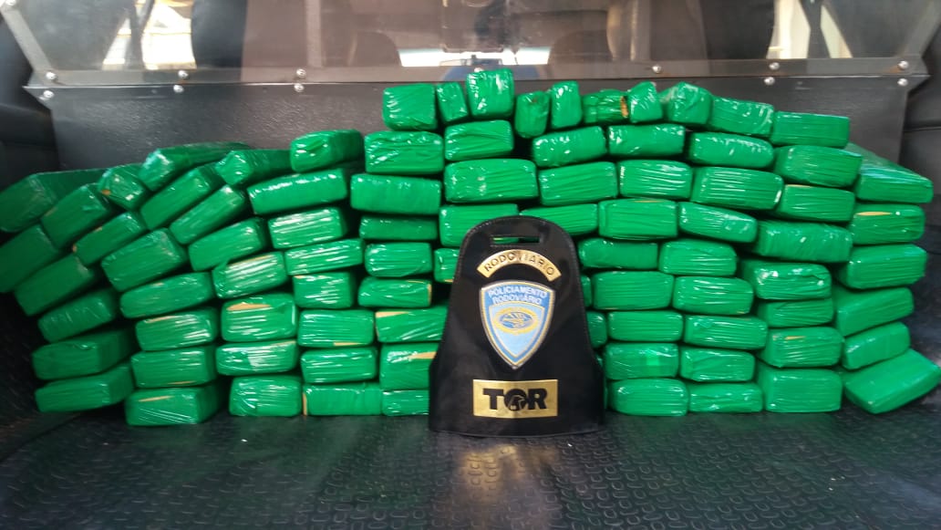 Durante vistoria veicular a equipe logrou êxito em localizar 94 tabletes de maconha, que após pesados perfizeram 71,600 Kg da droga.