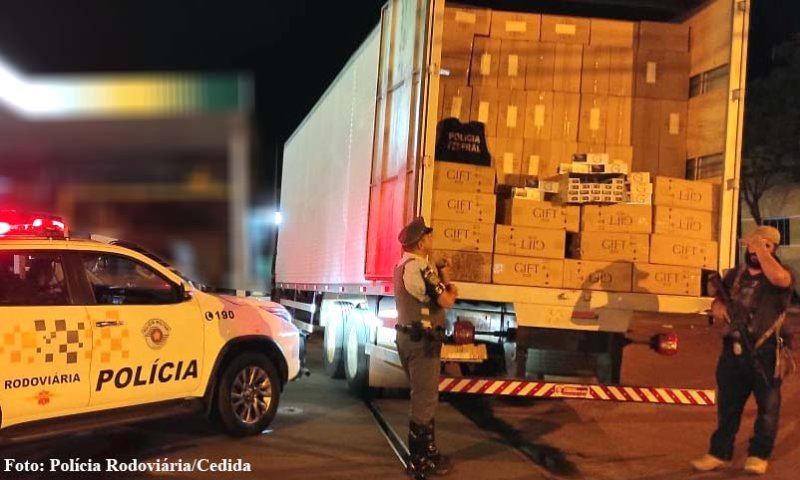 A Polícia Militar Rodoviária, em conjunto com a Polícia Federal de Presidente Prudente (SP), apreendeu uma carga de 500.000 maços de cigarros contrabandeados que era transportada em uma carreta que foi abordada em um via pública da cidade de Teodoro Sampaio (SP), no final da noite desse sábado, dia 3. O fato aconteceu por volta das 22h40 e a ocorrência foi encaminhada para a Delegacia de Polícia Federal de Presidente Prudente (SP).