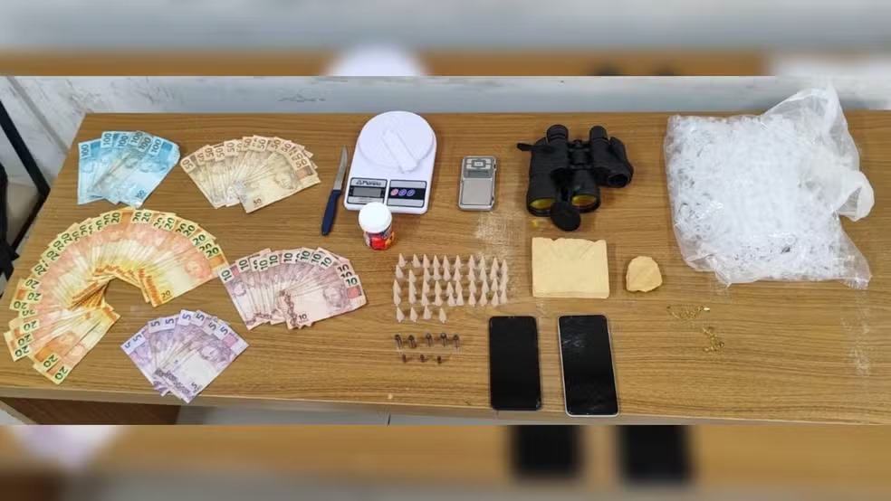 Os objetos foram apreendidos e o suspeito foi levado à delegacia, onde foi verificado o mandado de prisão em aberto por homicídio.