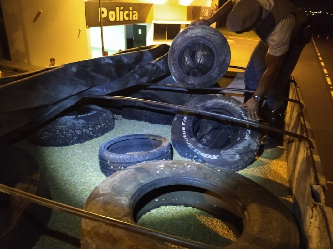 De acordo com o policiamento, no meio da carga de milho havia vários pneus de modelos diversos. Já no chassi do veículo havia caixas acopladas contendo videogames e celulares. Conforme apurado pela equipe, os produtos foram adquiridos no Paraguai e não havia documentação fiscal.