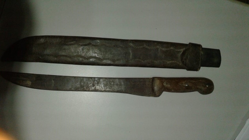 Já na busca veicular, os militares encontraram no console da camionete uma trouxinha, envolta em plástico na cor verde, contendo maconha e sobre o banco dianteiro do passageiro um cigarro artesanal de maconha. Além da droga, sob o banco do motorista foi localizada uma faca de aço em bainha de nylon na cor preta, sob o banco do passageiro um cassetete de madeira e atrás do banco do passageiro um facão.