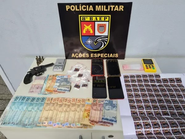 Em seguida, a corporação também foi à casa do homem denunciado, onde localizaram o restante da droga e material para endolação, o mesmo com que estavam embaladas as drogas encontradas. Também havia uma arma de fogo – revólver de calibre 32 – e munições, que ele assumiu a propriedade.