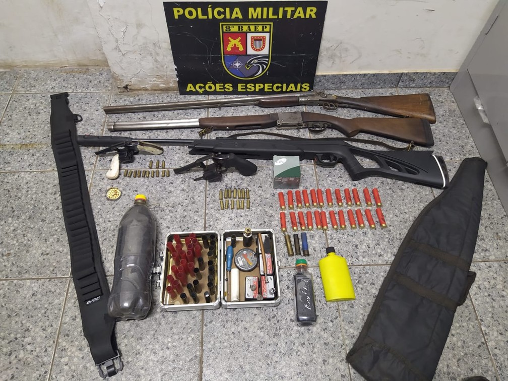 As equipes foram até a propriedade e, em buscas na residência, encontraram duas espingardas de calibre 28, com capacidade para dois disparos, além de uma espingarda de pressão 6,0 mm, 26 munições de calibre 28 intactas e 36 deflagradas, 10 munições de calibre 32 deflagradas e uma munição de calibre 38 intacta e seis deflagradas, 20 munições de calibre 22 intactas, 86 espoletas, um frasco de pólvora negra, um frasco de pólvora branca e apetrechos para recarga de cartuchos.