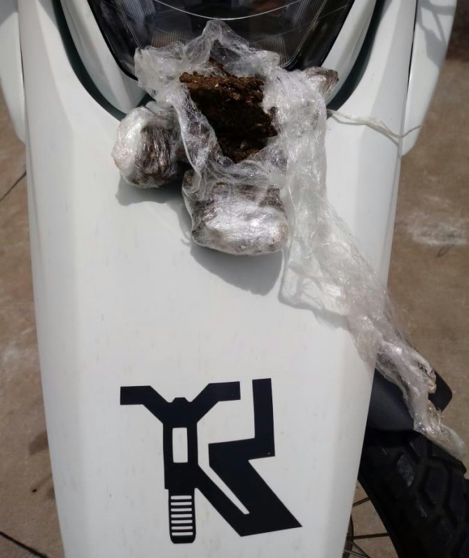 Ele foi alcançado e abordado. Foi solicitado apoio de uma viatura de área, onde o indivíduo foi revistado e no bolso da bermuda foram localizadas quatro porções grandes de maconha, totalizando 100 gramas da droga.
