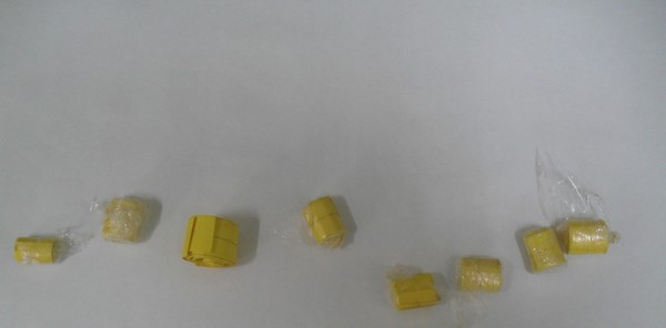Durante procedimento de revista na terceira encomenda, foram encontrados oito invólucros de suposto entorpecente conhecido como K4, camuflados em uma porção de doce quebra-queixo.